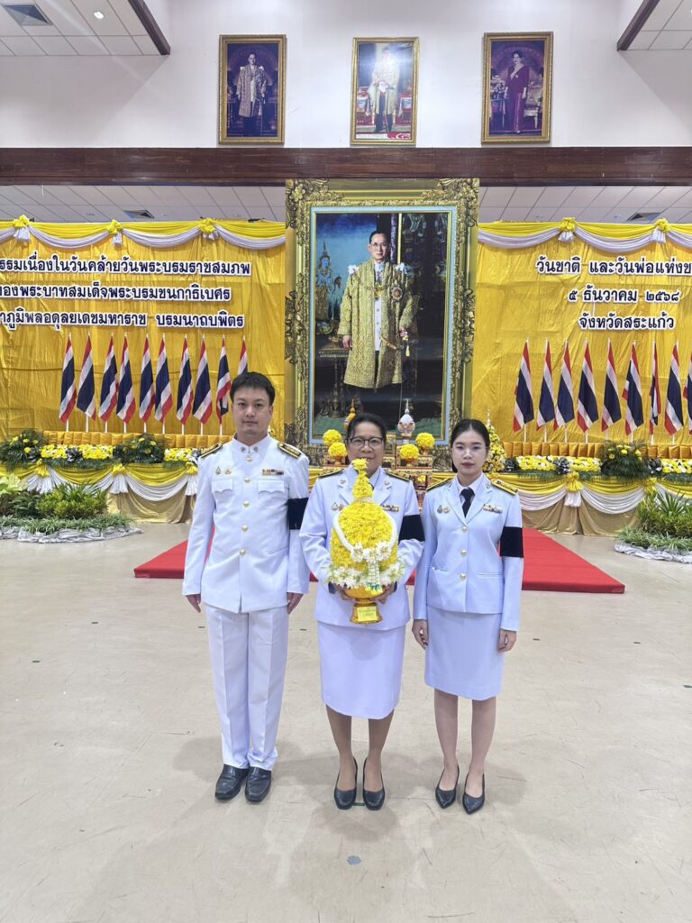 วันศุกร์ที่ ๕ ธันวาคม ๒๕๖๘ เวลา ๐๗.๐๐ น. สำนักตรวจเงินแผ่นดินจังหวัดสระแก้ว นำโดย นางสาวชลธี รัศมี ผู้อำนวยการกลุ่มพร้อมด้วยข้าราชการในสังกัด เข้าร่วมพิธีสวดพระพุทธมนต์ ทำบุญตักบาตรถวายพระราชกุศล พิธีวางพานพุ่มดอกไม้ และถวายราชสดุดี เนื่องในวันคล้ายวันพระราชสมภพของพระบาทสมเด็จพระบรมชนกาธิเบศร มหาภูมิพลอดุลยเดชมหาราช